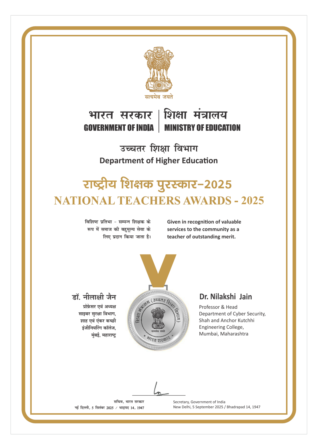 Dr. Nilakshi Jain was conferred with the prestigious National Teachers' Award, the highest national recognition for educators in India.